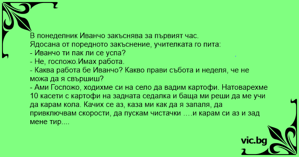 - Каква работа бе Иванчо? Какво прави събота и неделя, че не можа да я свършиш?