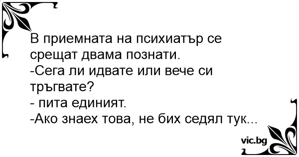 В приемната на психиатър се срещат двама познати.