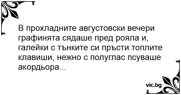 В прохладните августовски вечери графинята сядаше пред рояла и, галейки с тънките си пръсти топлите клавиши, нежно с полуглас псуваше акордьора...