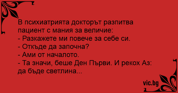 U psychiatry: - Trochę się pogubiłem w Pańskiej historii. Czy mógłby Pan zacząć od początku? - No dobrze. A więc, na początku stworzyłem ziemię...
