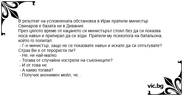 През цялото време от кацането си министърът стоял без да си показва носа навън и припирал да си ходи. Пратили му психолога на батальона, който го попитал: