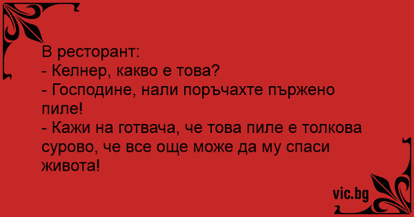 - Кажи на готвача, че това пиле е толкова сурово, че все още може да му спаси живота!