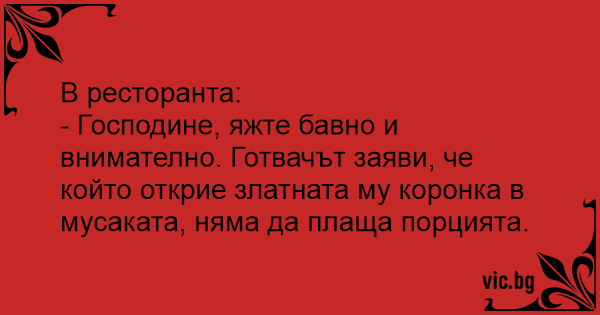 - Господине, яжте бавно и внимателно. Готвачът заяви, че който открие златната му коронка в мусаката, няма да плаща порцията.