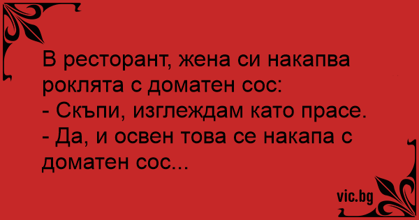 Merge unul cu nevastă-sa să ia cina la restaurant. Farfuria de supă se varsă pe rochia ei cea nouă. Supărată şi aşteptând să fie consolată de soţul romantic, ea zice: - Uite cum arăt, ca o scroafă!...