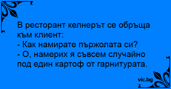 Ober: “Hoe vond u de biefstuk, mevrouw?” Mevrouw: “Per toeval, toen ik onder een blaadje sla keek.”