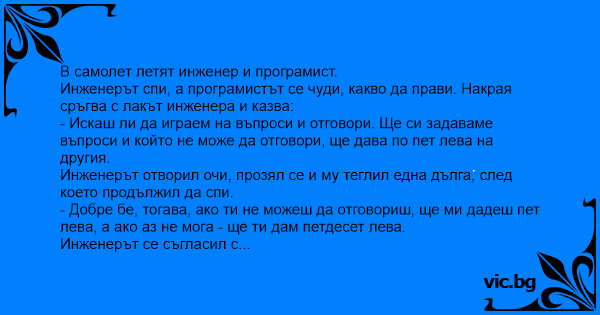 Програмистът е в шок, отваря лаптопа, търси отговора в Интернет, звъни по мобифона, праща електронна поща на приятели, но отговор не намира. Накрая вади петдесет лева и ги подава на инженера с думите: