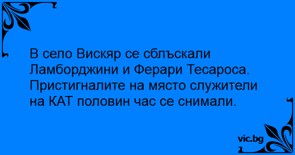В село Вискяр се сблъскали Ламборджини и Ферари Тесароса.