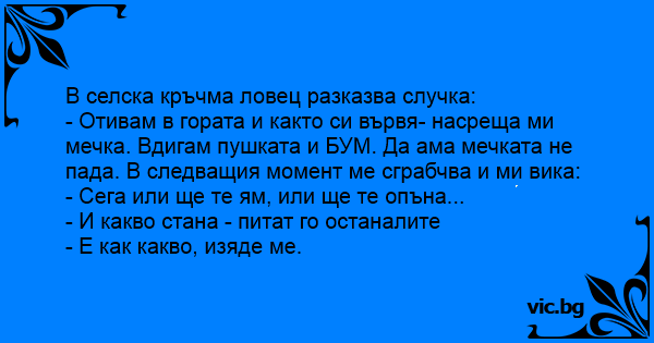 - Отивам в гората и както си вървя- насреща ми мечка. Вдигам пушката и БУМ. Да ама мечката не пада. В следващия момент ме сграбчва и ми вика: