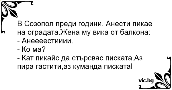 В Созопол преди години. Анести пикае на оградата.Жена му вика от балкона: