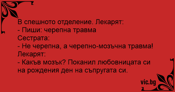Во брзата помош докторот и диктира на сестрата: - Сестро, за овој пациент запиши дијагноза „повреда на черепот“. - А потрес на мозокот докторе? - Ма каков мозок? Со швалерката отишол на роденден...
