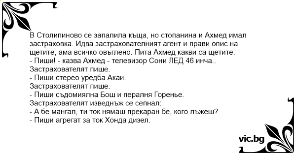 В Столипиново се запалила къща, но стопанина и Ахмед имал застраховка. Идва застрахователният агент и прави опис на щетите, ама всичко овъглено. Пита Ахмед какви са щетите: