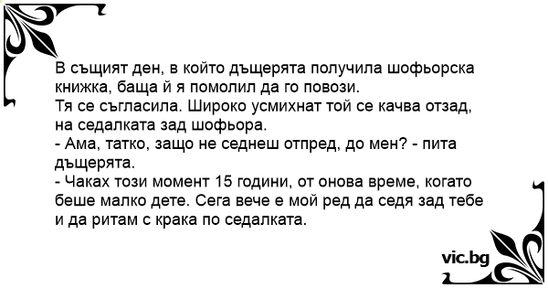 В същият ден, в който дъщерята получила шофьорска книжка, баща й я помолил да го повози.