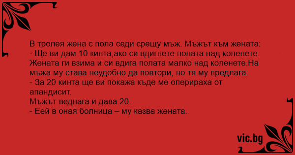 Жената ги взима и си вдига полата малко над коленете.На мъжа му става неудобно да повтори, но тя му предлага: