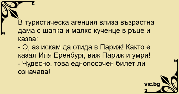 В туристическа агенция влиза възрастна дама с шапка и малко кученце в ръце и казва: - О, аз искам да отида в Париж! Както е казал Иля Еренбург, виж Париж и умри! - Чудесно, това еднопосочен билет ли означава!