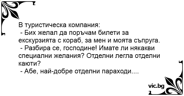 - Разбира се, господине! Имате ли някакви специални желания? Отделни легла отделни каюти?