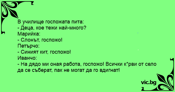В училище госпожата пита:<br />- Деца, кое тежи най-много?<br />Марийка:<br />- Слонът, госпожо!<br />Петърчо:<br />- Синият кит, госпожо!<br />Иванчо:<br />- На дядо ми оная работа, госпожо! Всички kуpbи от село да се съберат, пак не могат да го вдигнат!