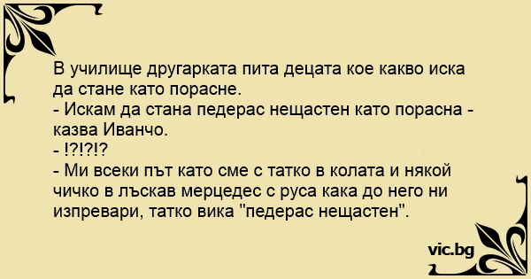 - Ми всеки път като сме с татко в колата и някой чичко в лъскав мерцедес с руса кака до него ни изпревари, татко вика "педерас нещастен".