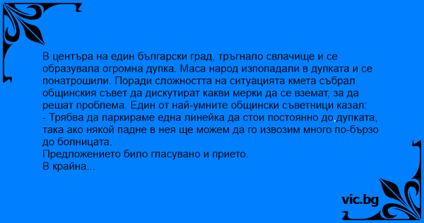 В центъра на един български град, тръгнало свлачище и се образувала огромна дупка. Маса народ изпопадали в дупката и се понатрошили. Поради сложността на ситуацията кмета събрал общинския съвет да дискутират какви мерки да се вземат, за да решат проблема. Един от най-умните общински съветници казал: