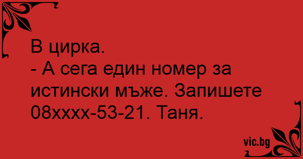 - А сега един номер за истински мъже. Запишете 08xxxx-53-21. Таня.