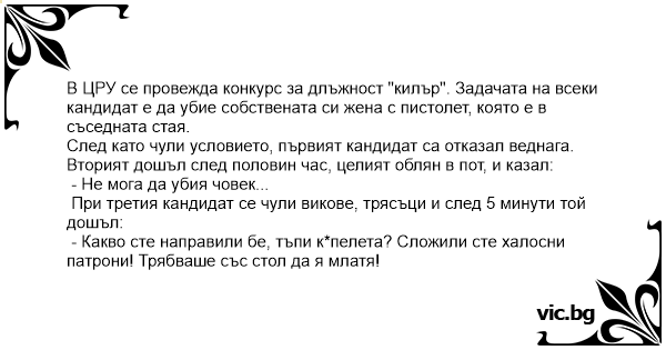 В ЦРУ се провежда конкурс за вакантно място за наемен убиец, последната задача е била: