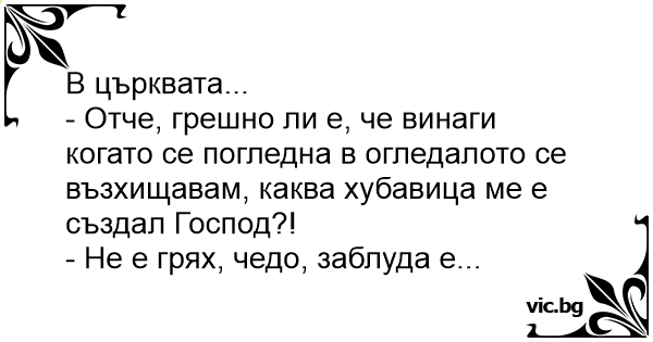 - Отче, грешно ли е, че винаги когато се погледна в огледалото се възхищавам, каква хубавица ме е създал Господ?!