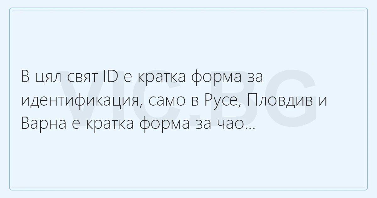 В цял свят ID е кратка форма за идентификация, само в Русе, Пловдив и Варна е кратка форма за чао... 1 0 0 Вицове от и за Пловдив Вицове за Варна, Вицове за варналии