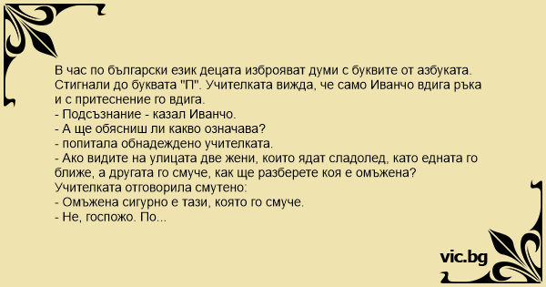 Стигнали до буквата "П". Учителката вижда, че само Иванчо вдига ръка и с притеснение го вдига.