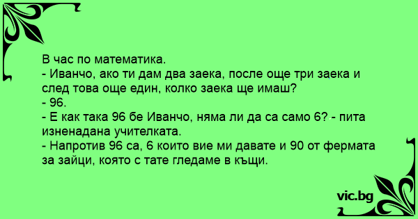 - Е как така 96 бе Иванчо, няма ли да са само 6? - пита изненадана учителката.