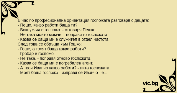 • Вицове от Facebook от нашата страница https://www.facebook.com/www.vic.bg
