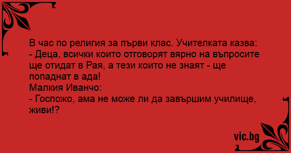 - Деца, всички които отговорят вярно на въпросите ще отидат в Рая, а тези които не знаят - ще попаднат в ада!