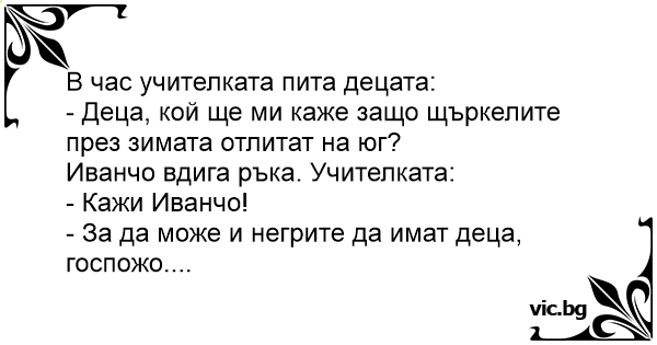 На уроці природознавства вчителька запитує: — Хто знає, чому лелеки на зиму відлітають ув Африку? Встає Вовочка: — Ясна річ, негри також хочуть мати дітей!