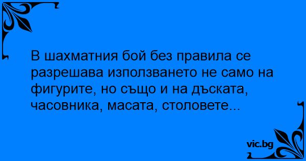 В шахматния бой без правила се разрешава използването не само на фигурите, но също и на дъската, часовника, масата, столовете...