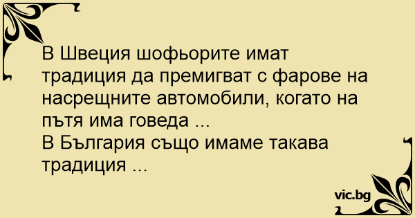 В Швеция шофьорите имат традиция да премигват с фарове на насрещните автомобили, когато на пътя има говеда ...