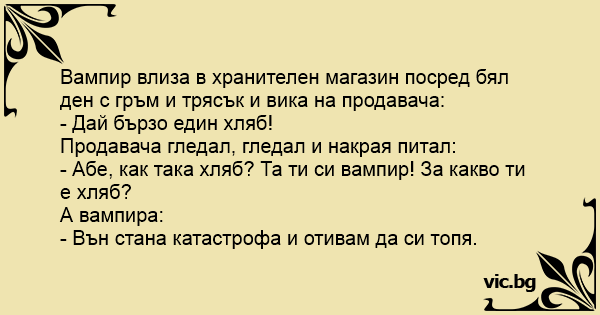 Вaмпир влиза в хранителен магазин посред бял ден с гръм и трясък и вика на продавача: