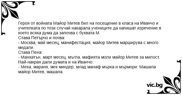 Героя от войната Майор Митев бил на посещение в класа на Иванчо и учителката по този случай накарала учениците да напишат изречение в което всяка дума да започва с буквата М.