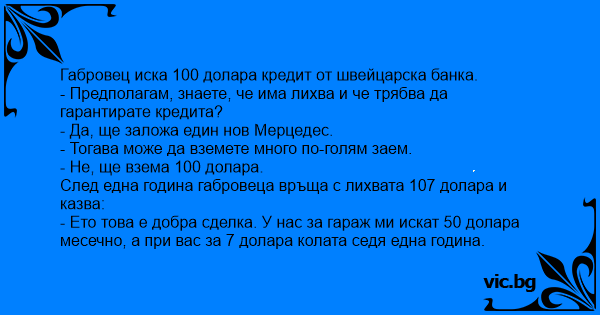 Ένας Εβραίος πηγαίνει σε μια τράπεζα στο Μανχάταν και ζητά να δει τον υπεύθυνο για τα δάνεια. Εξηγεί ότι θα πάει στην Ευρώπη για δουλειές και χρειάζεται 2.000 δολάρια. Ο υπεύθυνος λέει: -...
