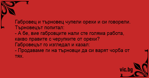 Габровец и търновец чупели орехи и си говорели.