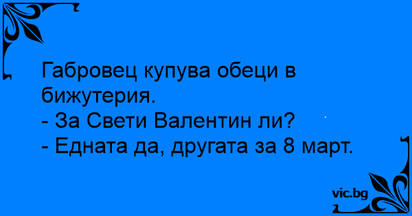 Влав купува обетки од "Се до 99 денари". Продавачката: - За Св. Валентин? - Едната да, другата за 8-ми март.