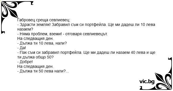 - Здрасти земляк! Забравил съм си портфейла. Ще ми дадеш ли 10 лева назаем?