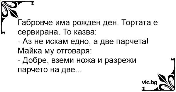 Габровче има рожден ден. Тортата е сервирана. То казва: