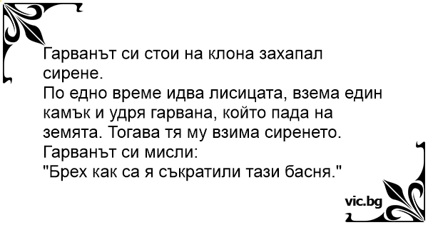 Гарванът си стои на клона захапал сирене. По едно време идва лисицата, взема един камък и удря гарвана, който пада на земята. Тогава тя му взима сиренето. Гарванът си мисли: "Брех как са я съкратили тази басня."