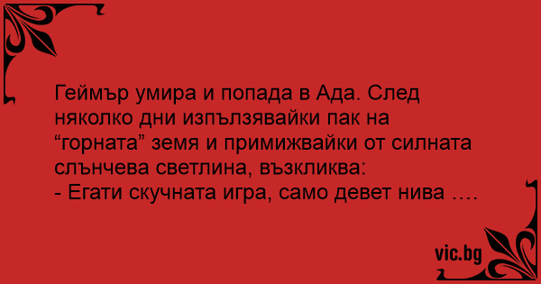 Геймър умира и попада в Ада. След няколко дни изпълзявайки пак на “горната” земя и примижвайки от силната слънчева светлина, възкликва:
