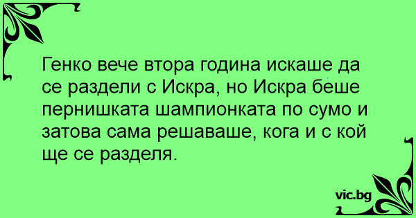 Генко вече втора година искаше да се раздели с Искра, но Искра беше пернишката шампионката по сумо и затова сама решаваше, кога и с кой ще се разделя.