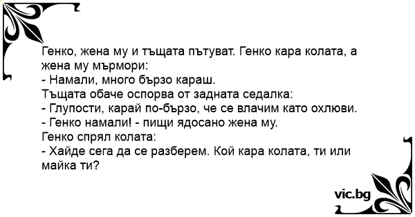 Генко, жена му и тъщата пътуват. Генко кара колата, а жена му мърмори: