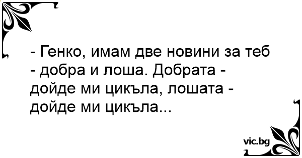 - Генко, имам две новини за теб - добра и лоша. Добрата - дойде ми цикъла, лошата - дойде ми цикъла...