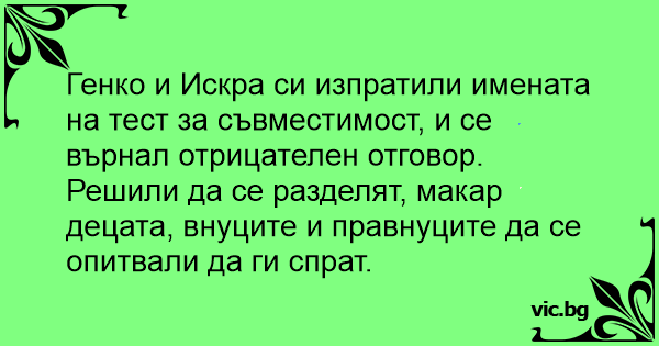 Генко и Искра си изпратили имената на тест за съвместимост, и се върнал отрицателен отговор.