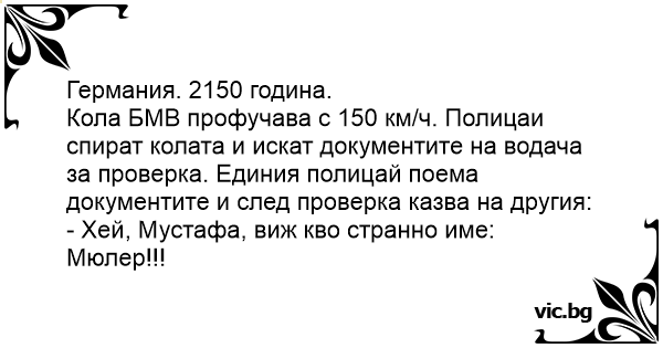 Кола БМВ профучава с 150 км/ч. Полицаи спират колата и искат документите на водача за проверка. Единия полицай поема документите и след проверка казва на другия: