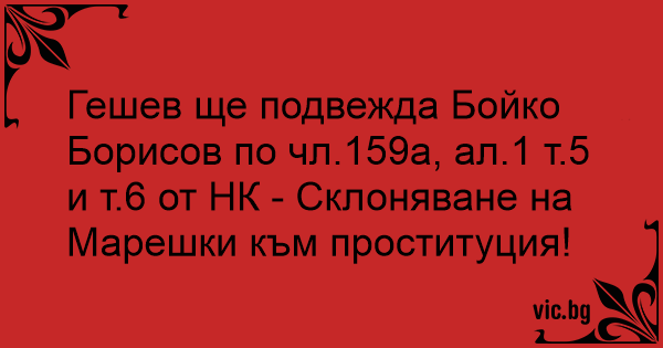 Гешев ще подвежда Бойко Борисов по чл.159а, ал.1 т.5 и т.6 от НК - Склоняване на Марешки към проституция!
