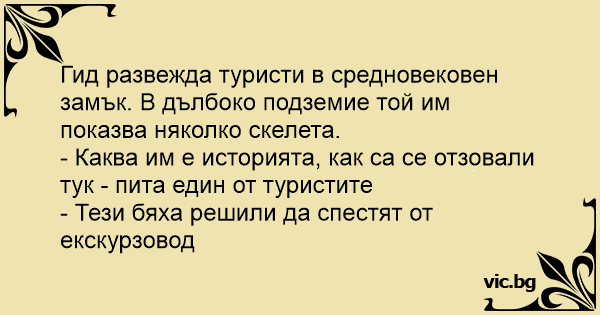 Гид развежда туристи в средновековен замък. В дълбоко подземие той им показва няколко скелета.