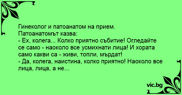 Топла лятна вечер. От болницата излизат патолог и гинеколог. С бавна походка двамата вървят към домовете си, вдишват с пълни гърди свежия въздух и се възхищават на природата. Патологът: